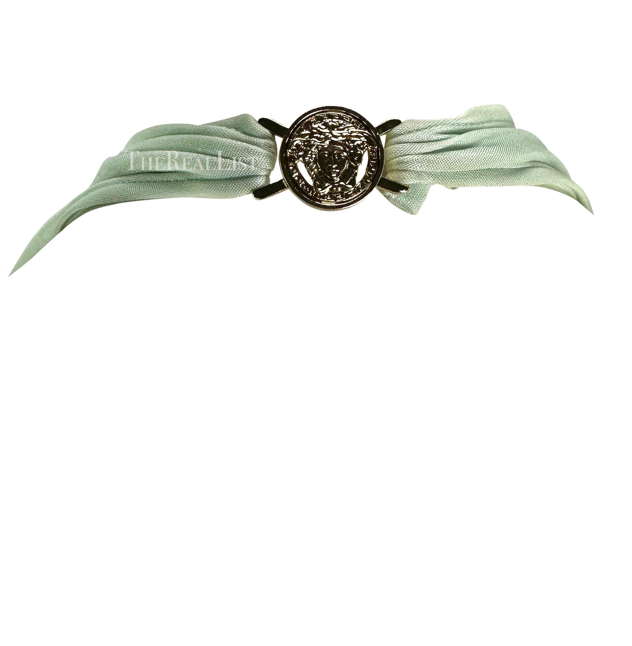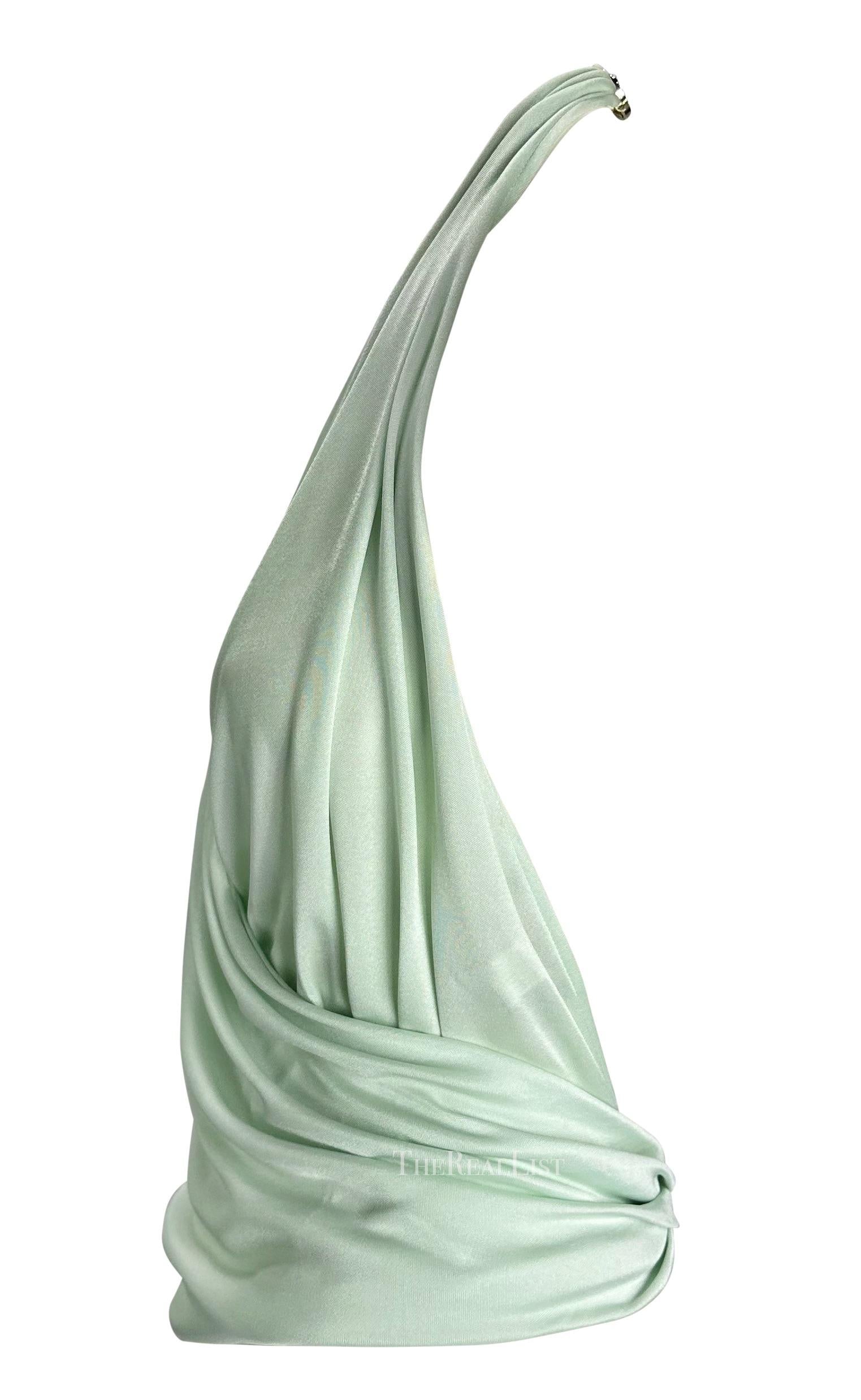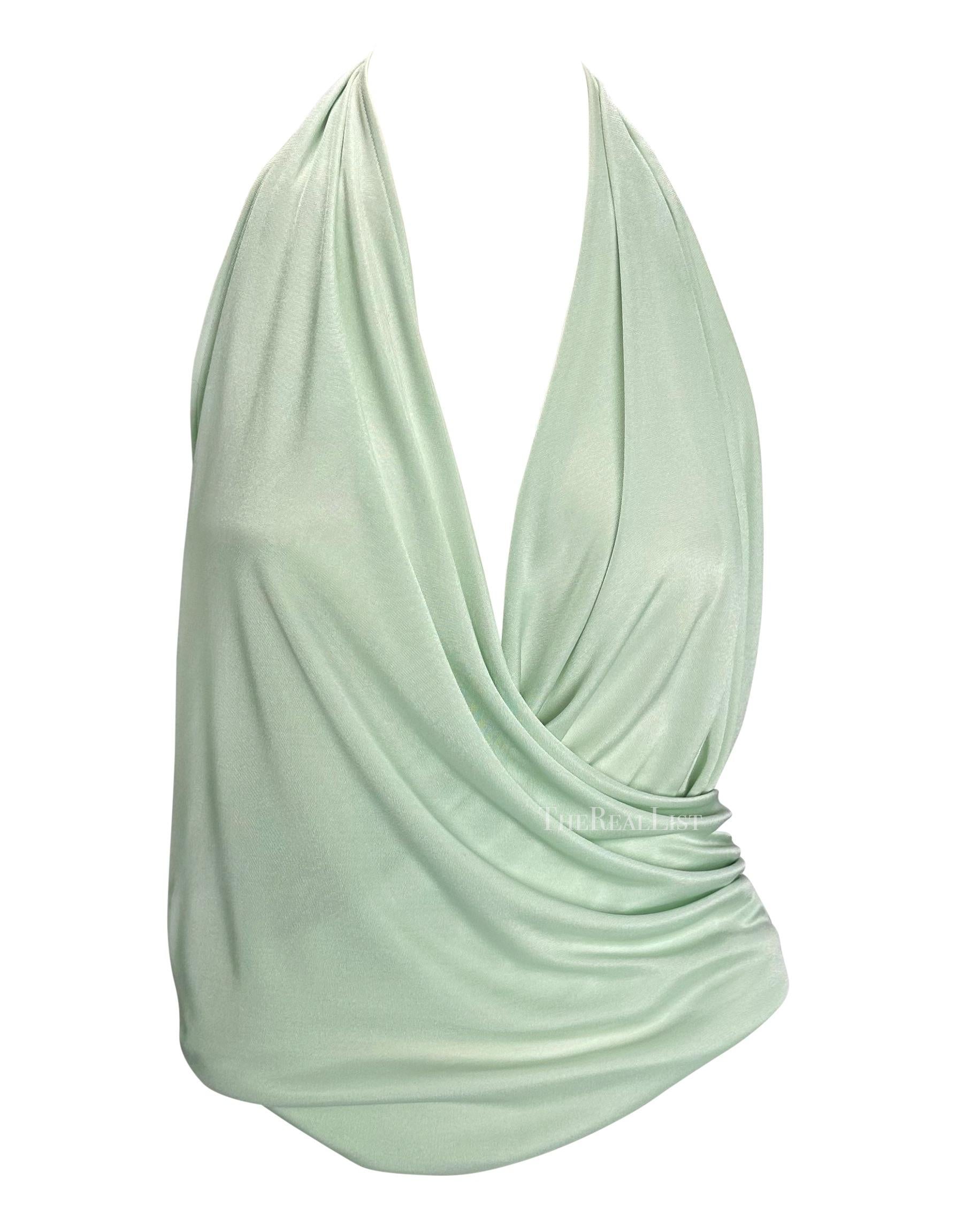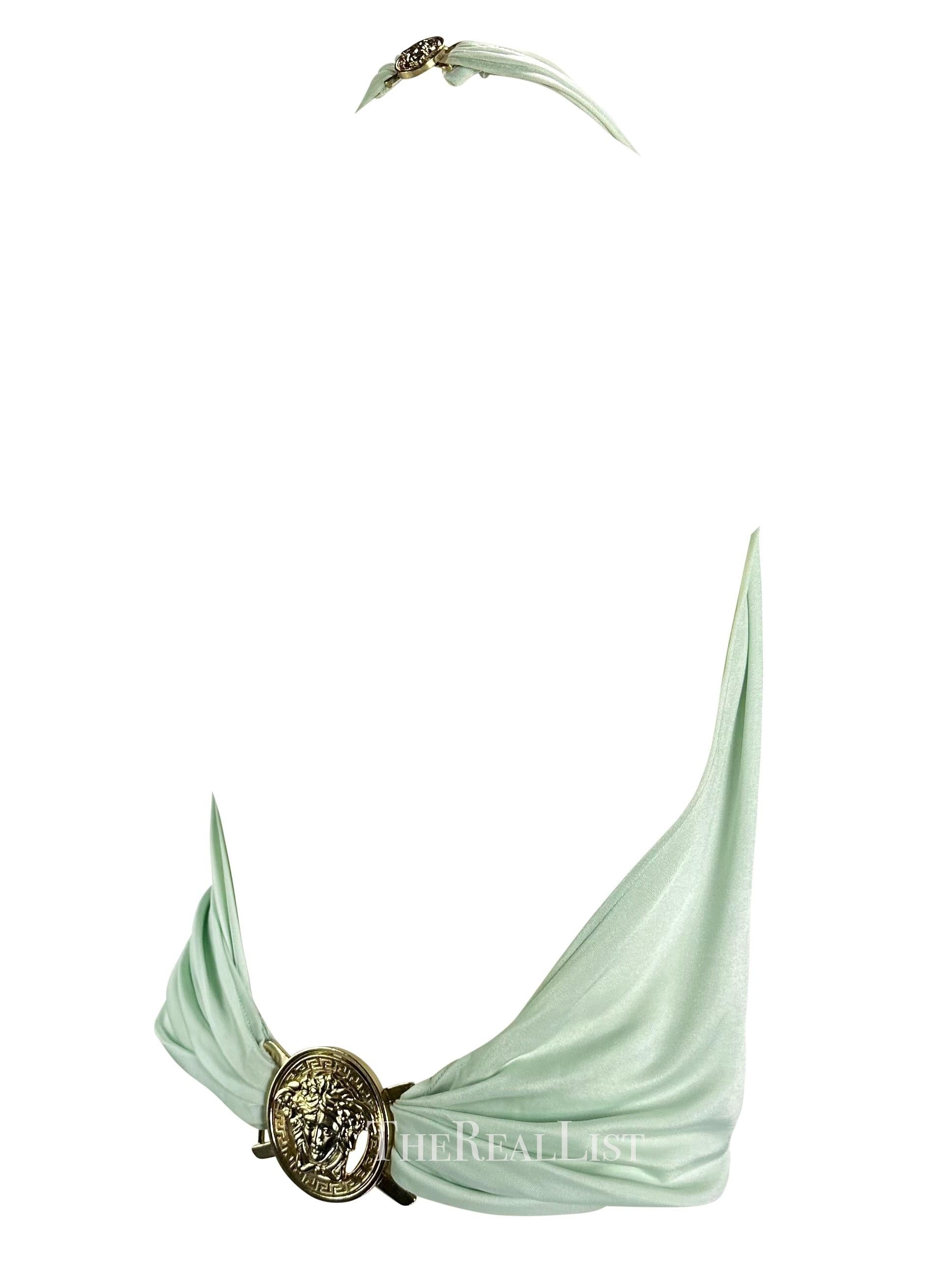 Presenting a mint-colored Versace halter neck designed by Donatella Versace. From the Spring/Summer 2005 collection, this wrap halter neck top is complete with a large interlocking Versace Medusa medallion at the lower back and a smaller Medusa at the nape. This ultra-sexy vintage top features an exposed back and plunging neckline.