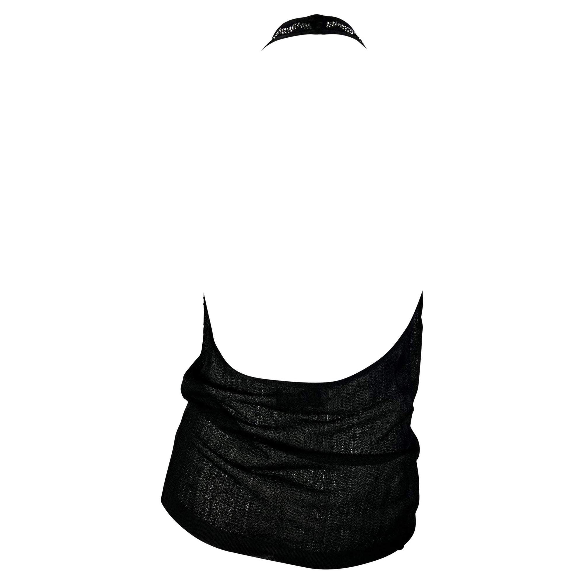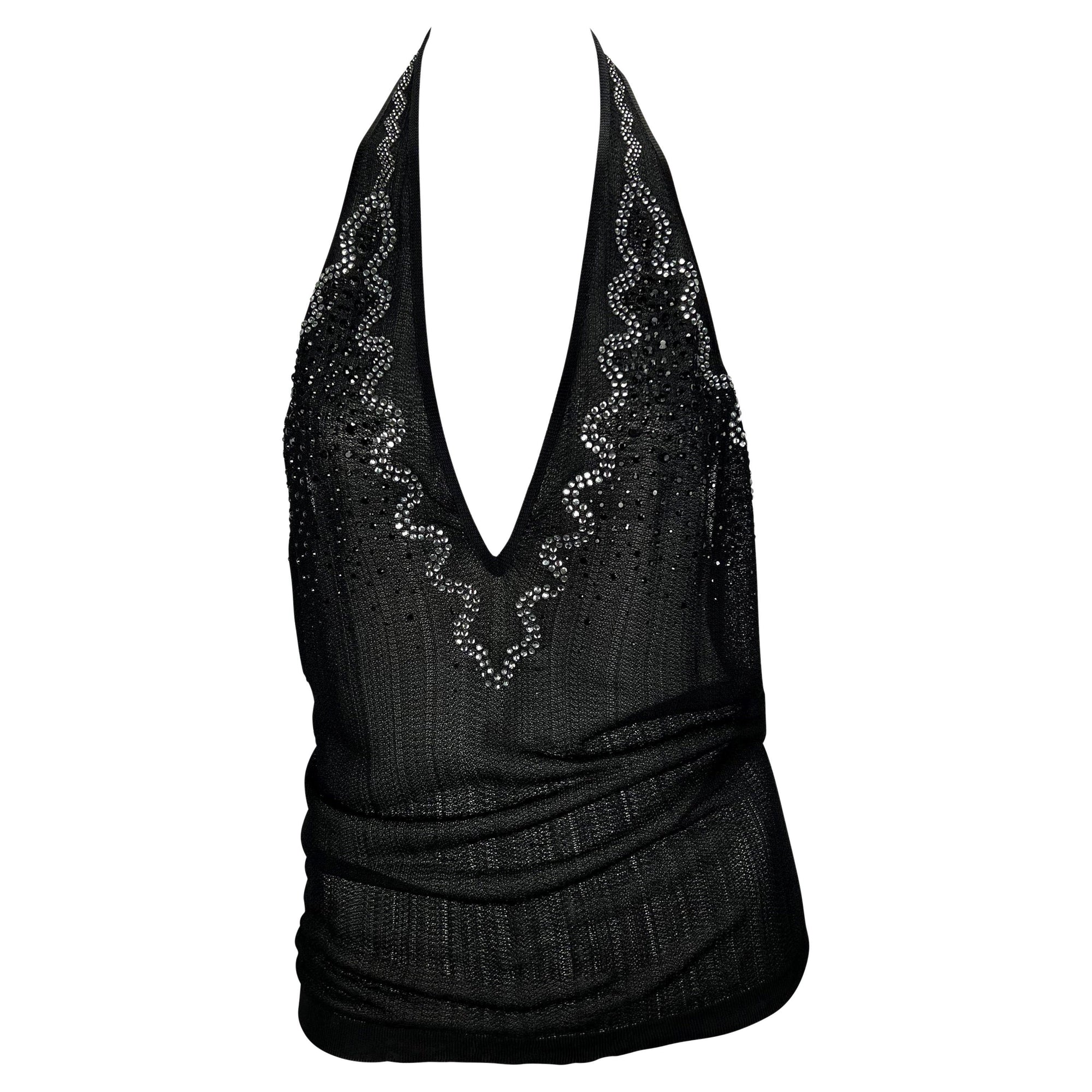 This Yves Saint Laurent Rive Gauche halter top, designed by Stefano Pilati, is crafted in black semi-sheer knit with rhinestone embellishments at the front. The design features a plunging neckline and low back, embodying the sultry aesthetic of the early 2000s. The same style was notably worn by Lindsay Lohan in December 2004 to Z100’s Jingle Ball.