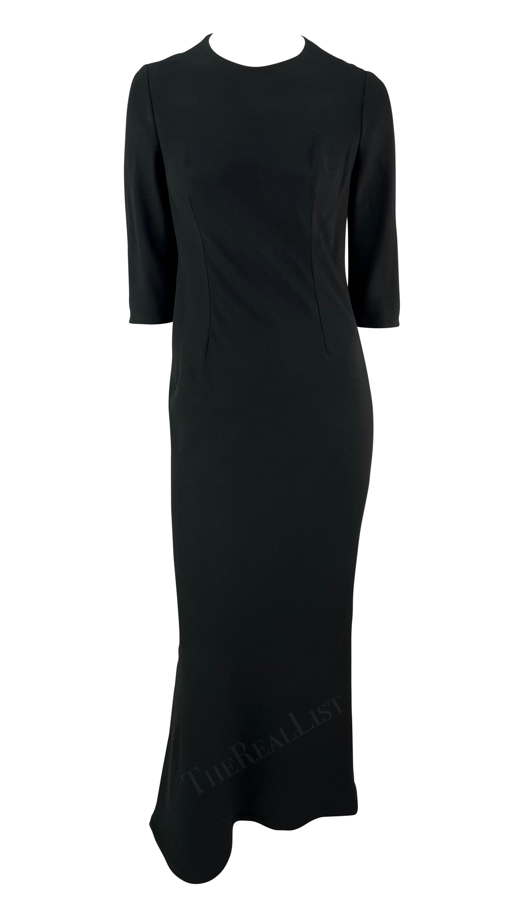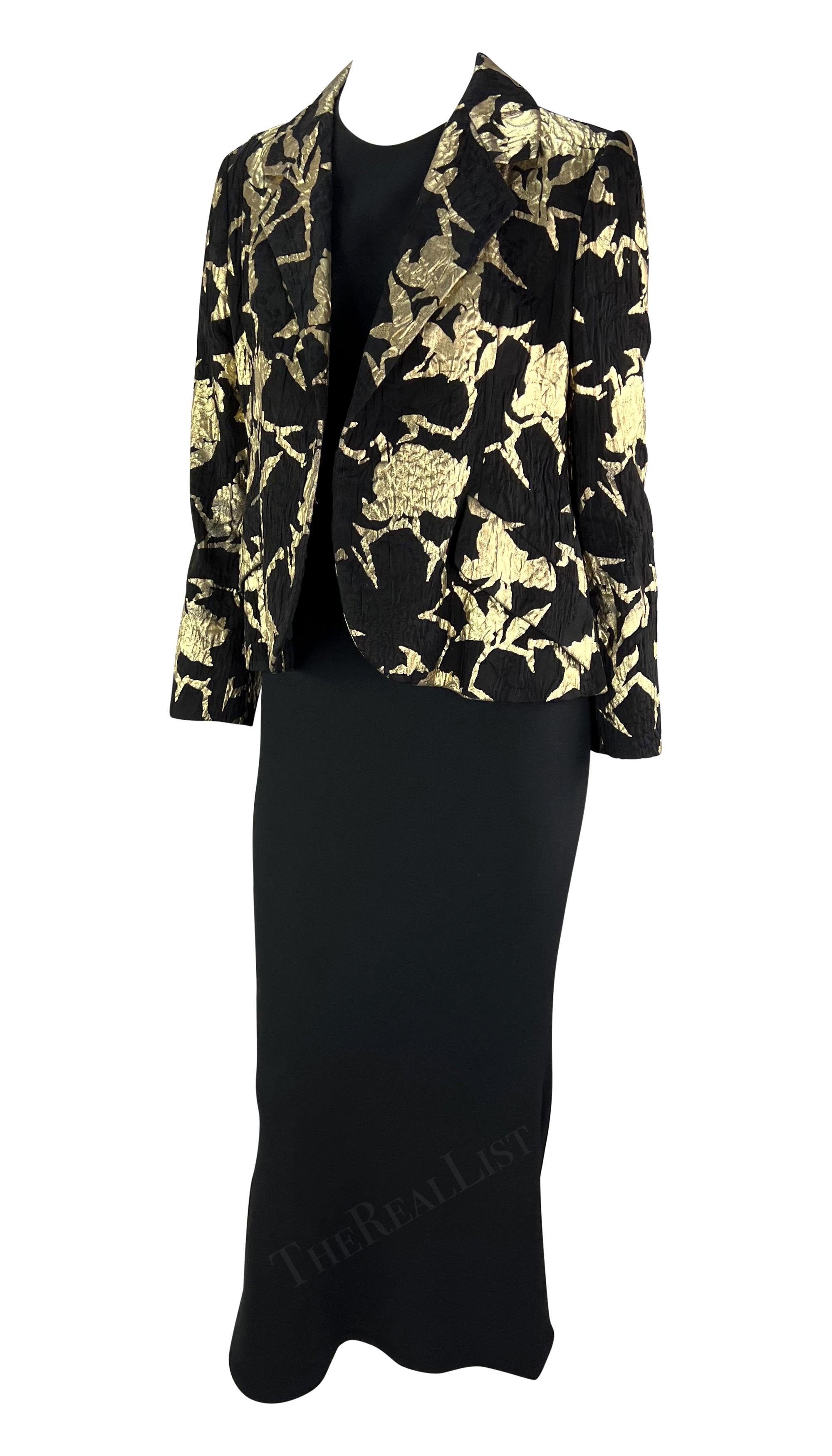 This Christian Dior haute couture dress set from the Spring/Summer 2006 collection by John Galliano includes a long black gown with cropped sleeves and a subtly flared hem, paired with a coordinating jacket. The jacket is detailed with a fold-over collar and an abstract gold floral motif applied over an intentionally wrinkled base. Custom ordered and entirely handmade.