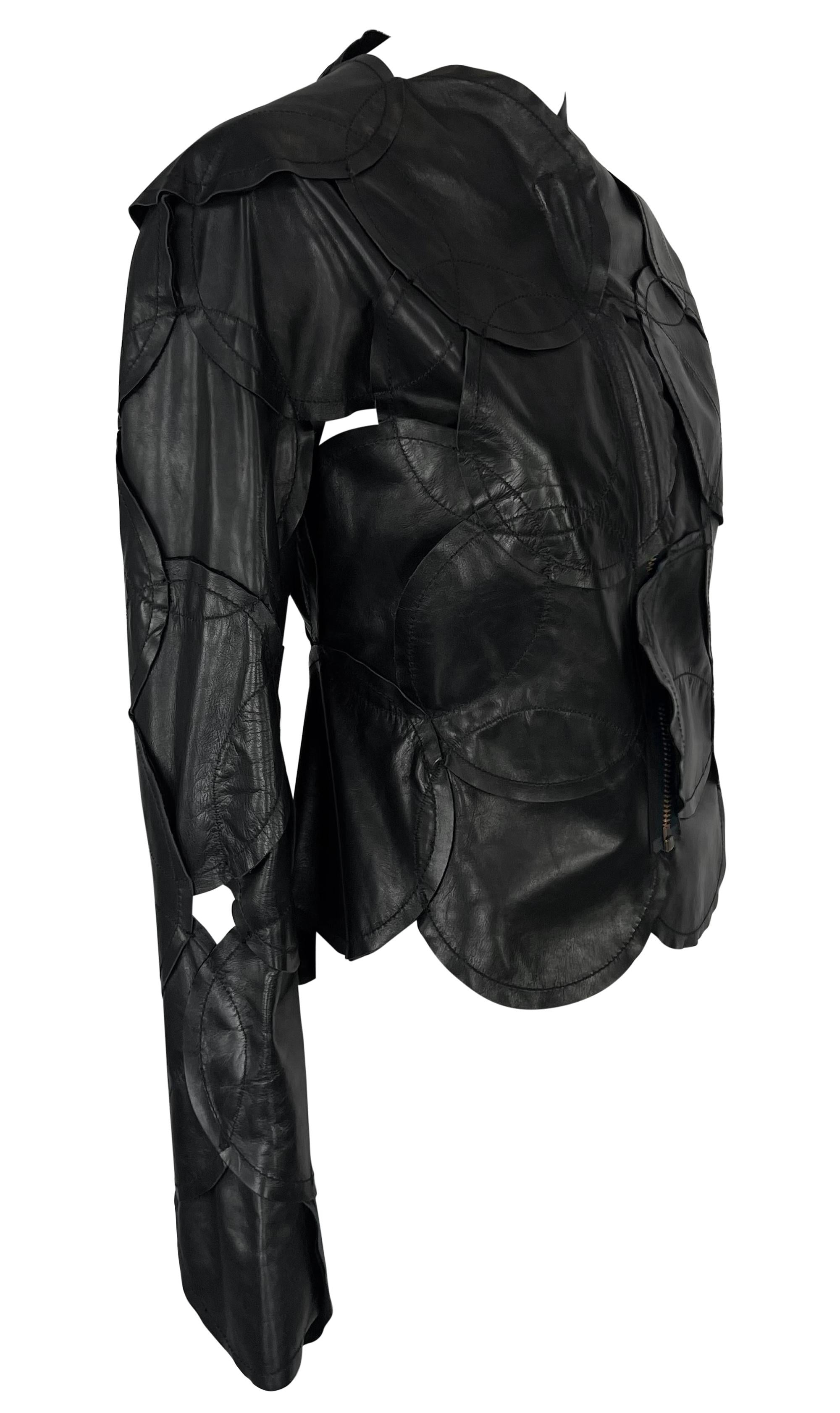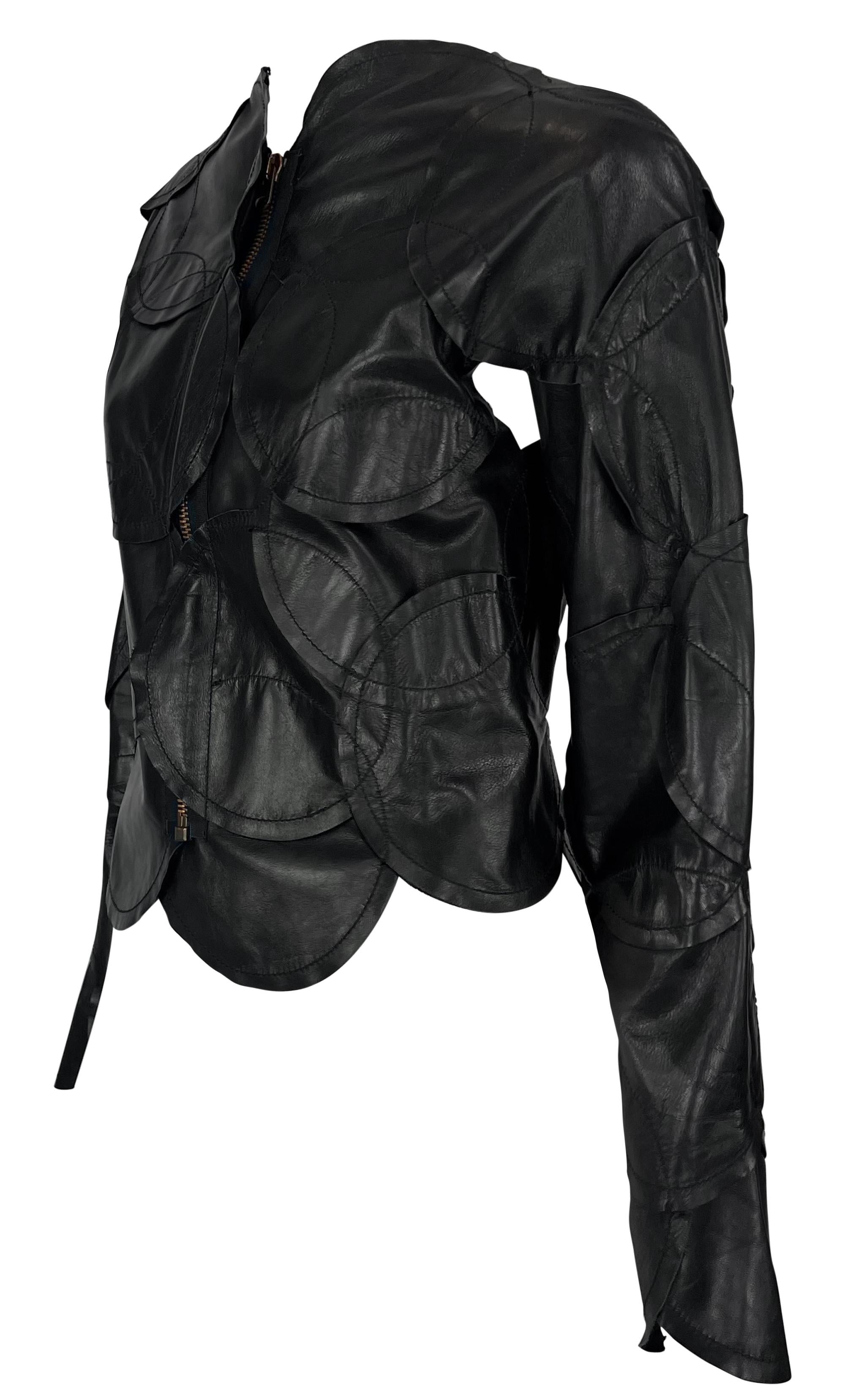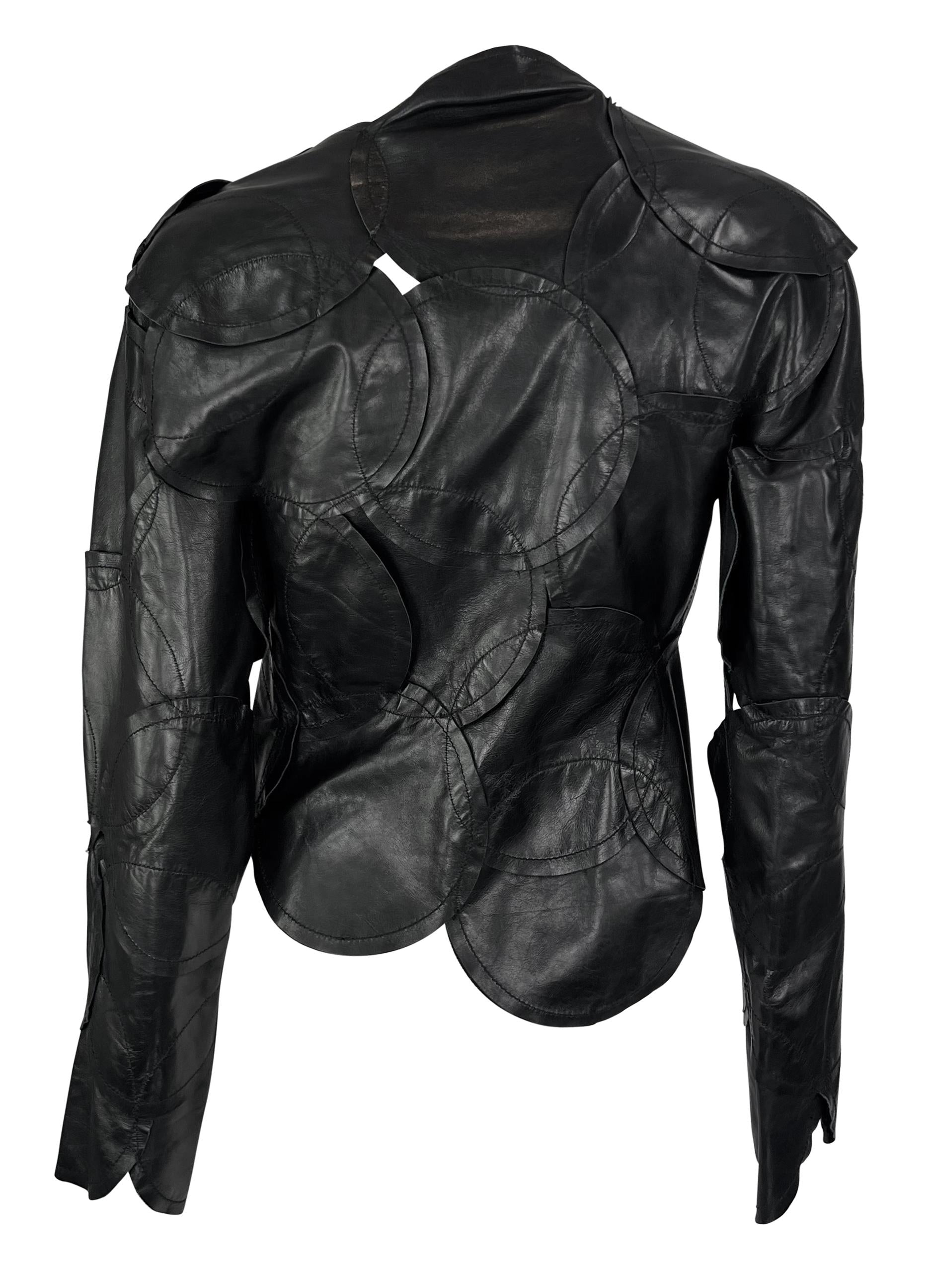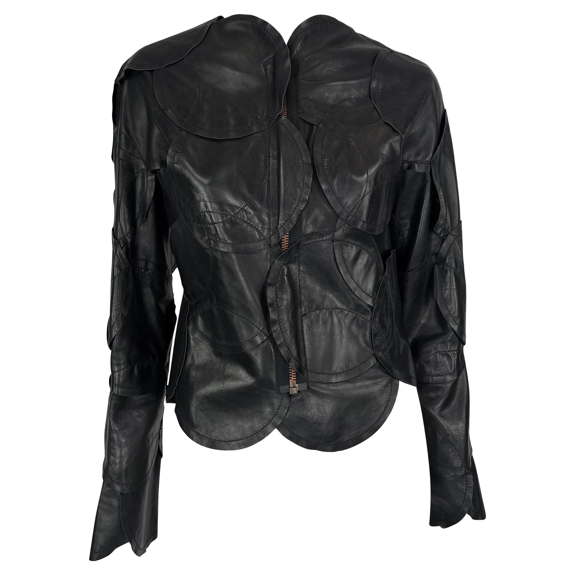 This black leather jacket from Maison Martin Margiela's Spring/Summer 2006 runway collection features a distinctive open patchwork design, crafted from overlapping circular leather panels. The collection is remembered for its work-in-progress inspiration. Its deconstructed silhouette and exposed stitching embody Margiela's avant-garde approach, creating a striking, layered texture.