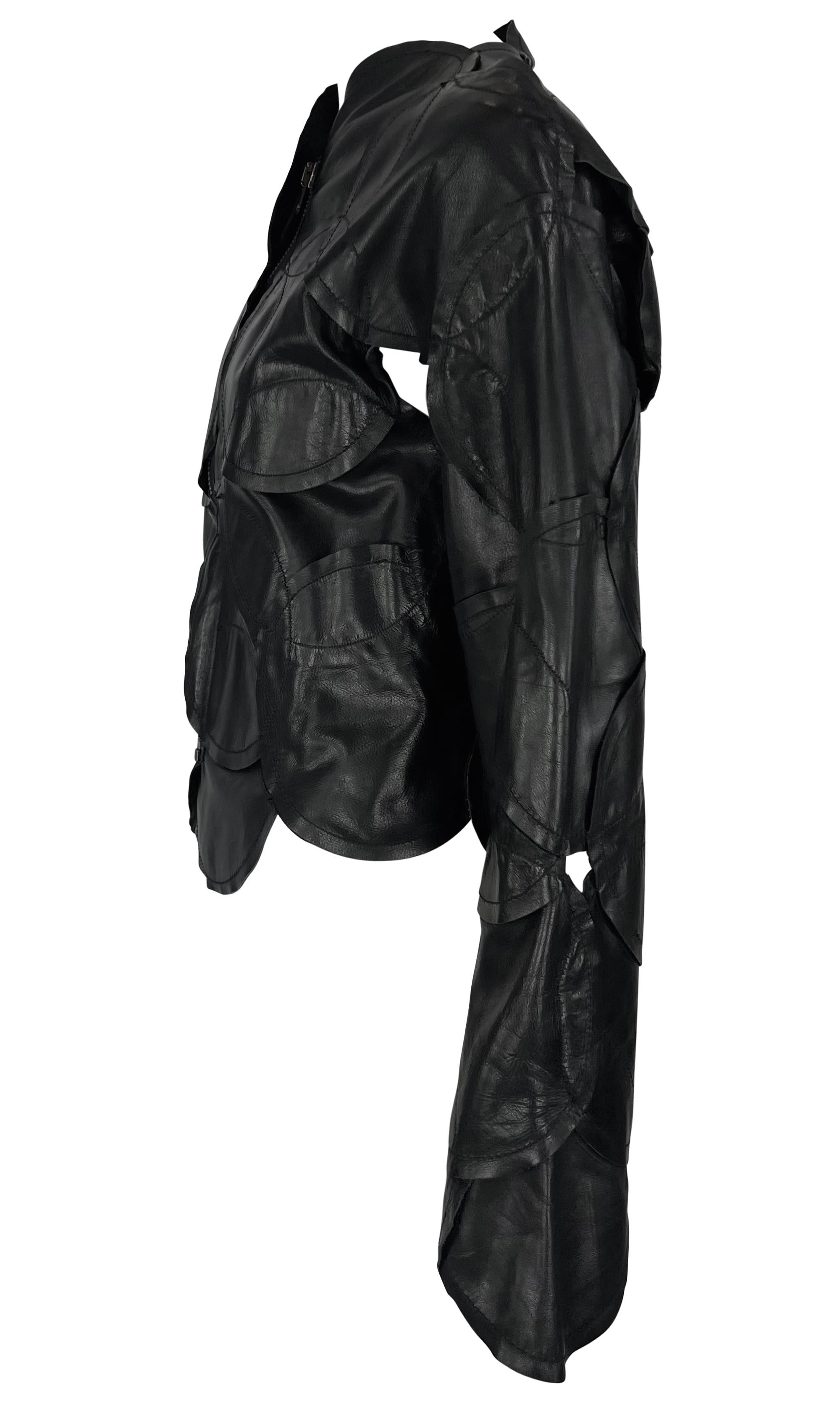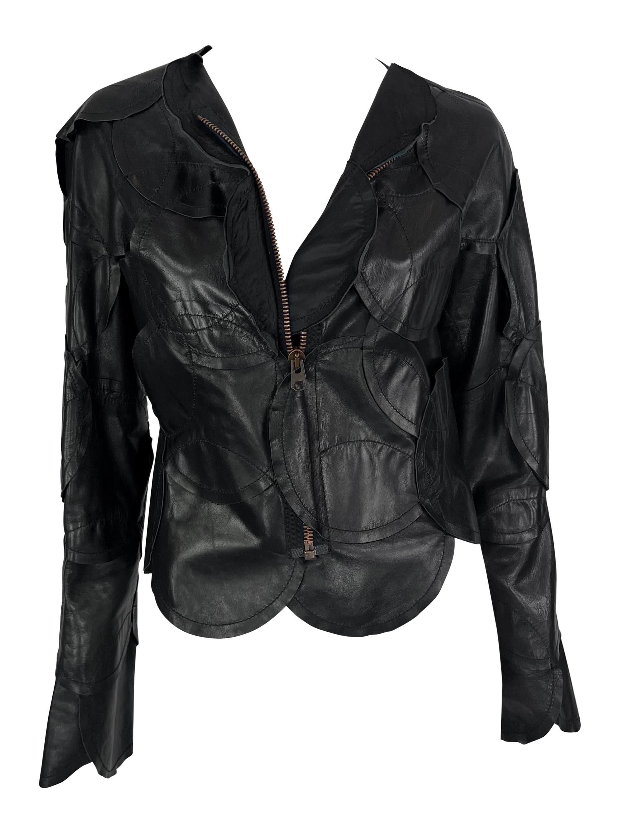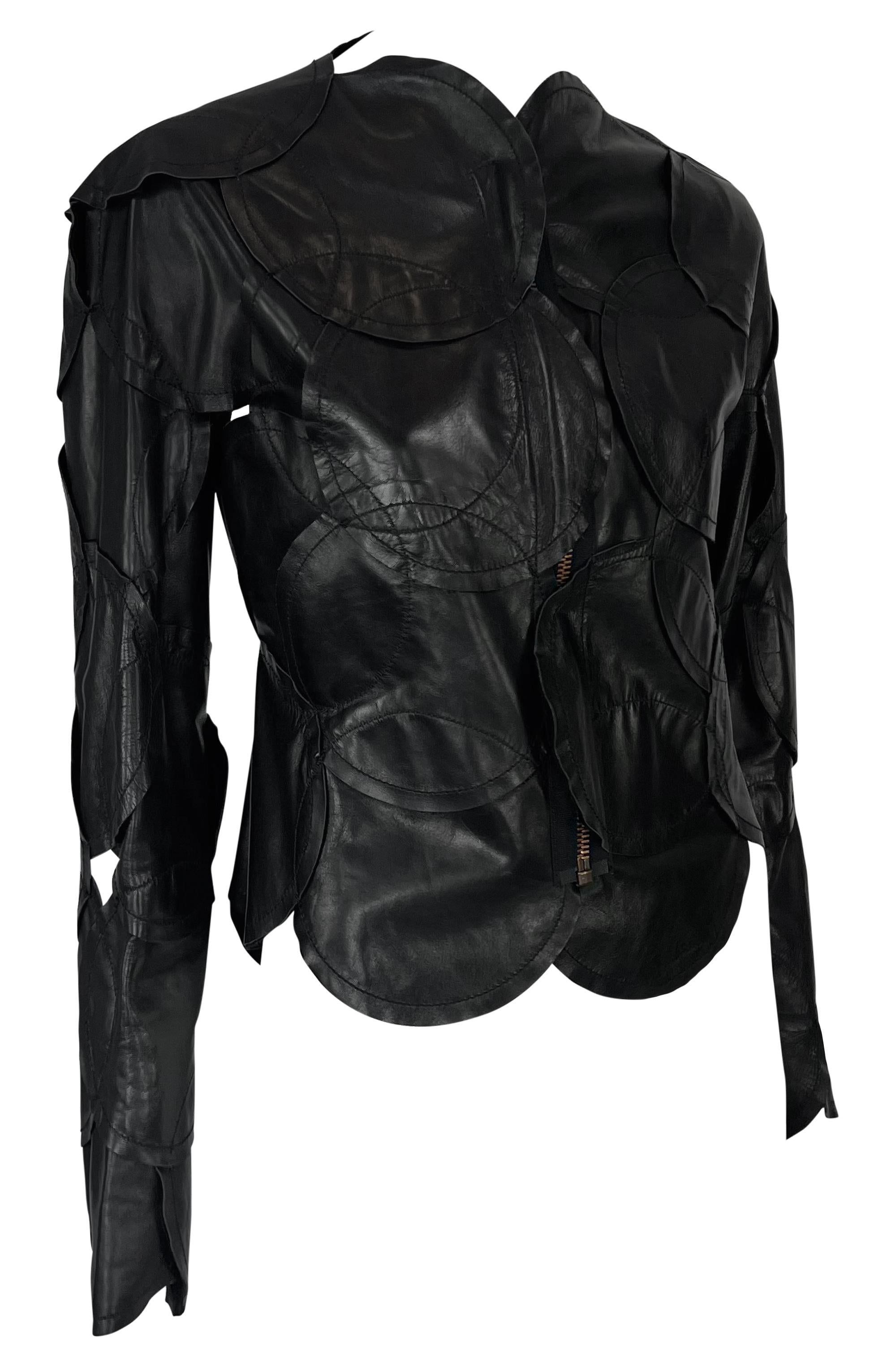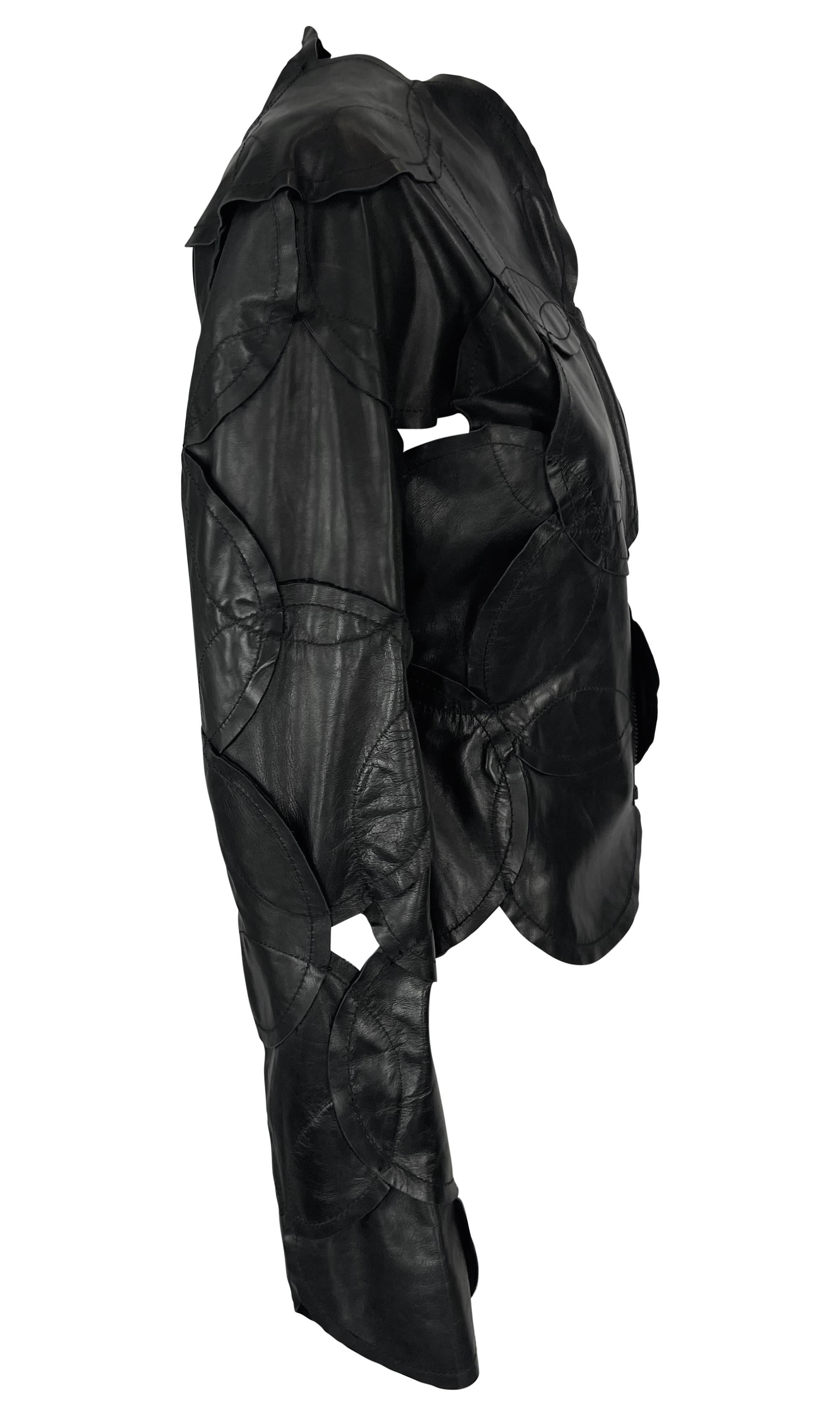 This black leather jacket from Maison Martin Margiela's Spring/Summer 2006 runway collection features a distinctive open patchwork design, crafted from overlapping circular leather panels. The collection is remembered for its work-in-progress inspiration. Its deconstructed silhouette and exposed stitching embody Margiela's avant-garde approach, creating a striking, layered texture.