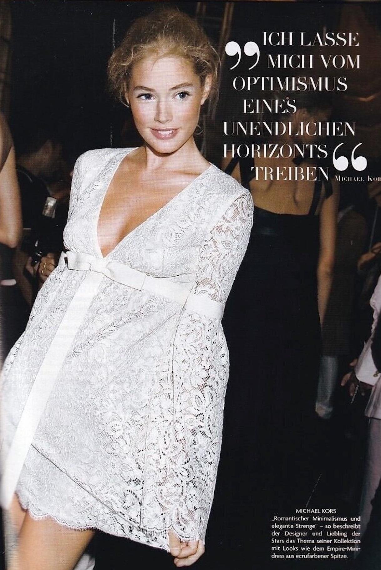 From Michael Kors’ Spring/Summer 2006 collection, this cream lace mini dress features a plunging neckline, soft scalloped hem, and a grosgrain bow accent below the bust. A long-sleeve variation was modeled by Doutzen Kroes on the runway and worn by Carmen Kass in the season’s ad campaign. Also featured in the January 2006 issue of Vogue Germany.