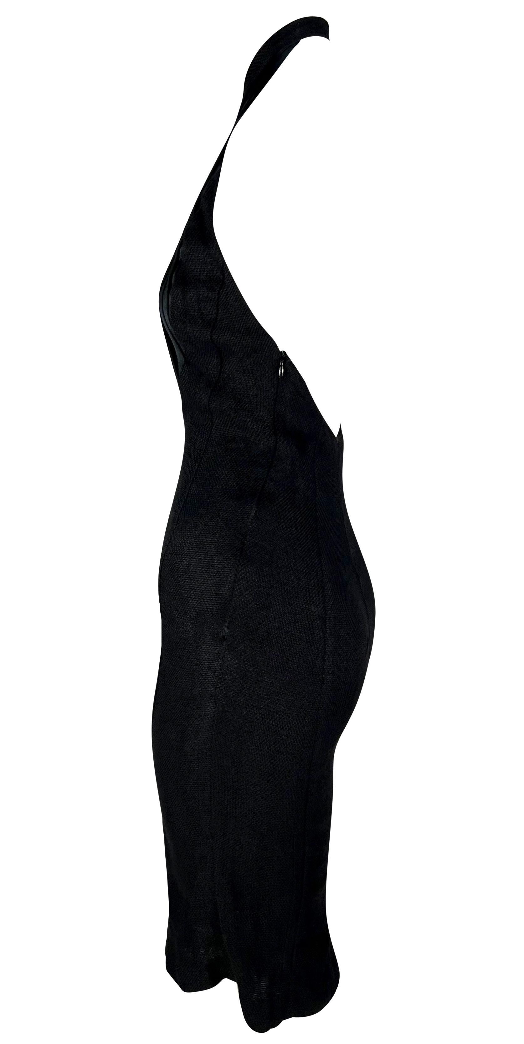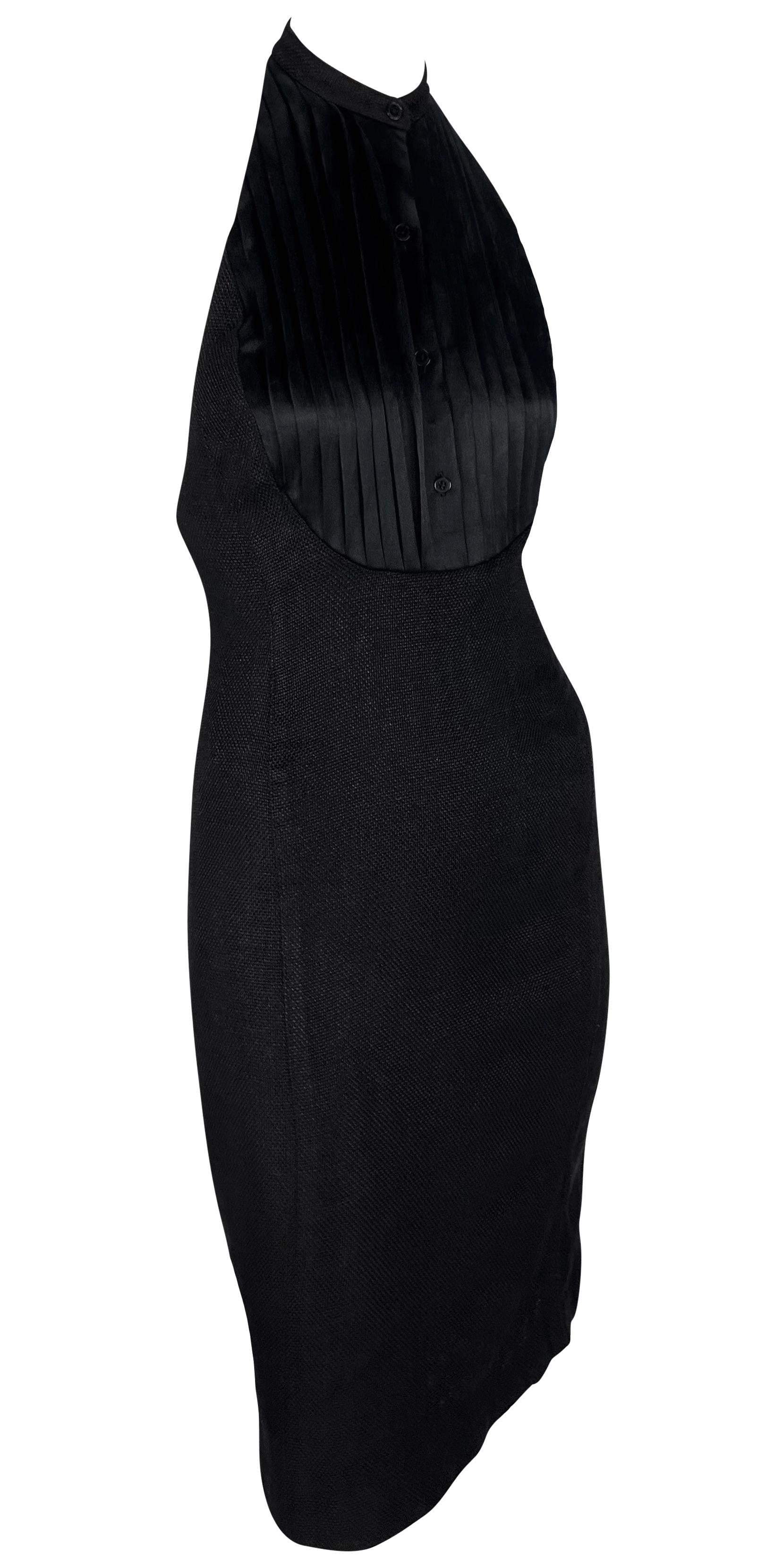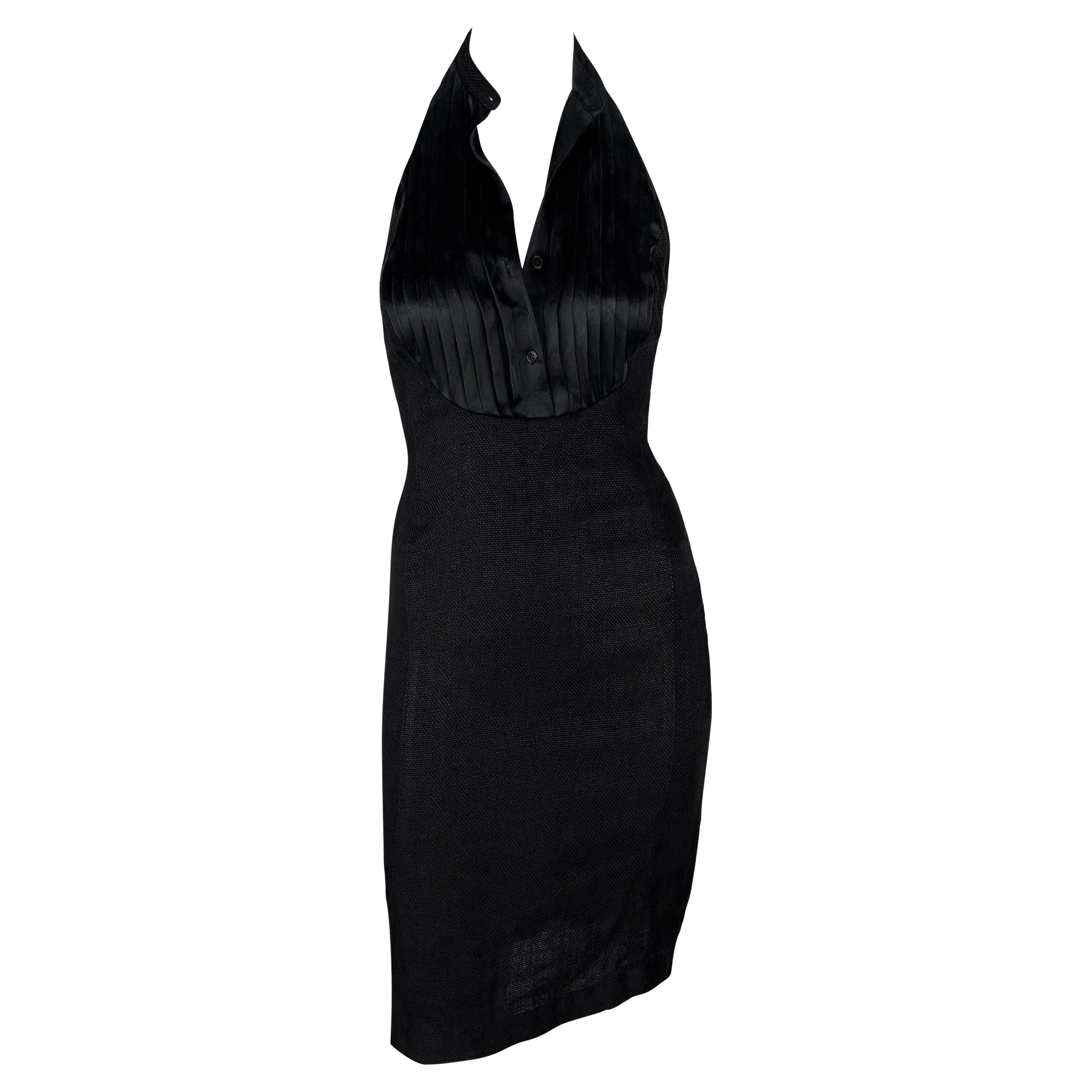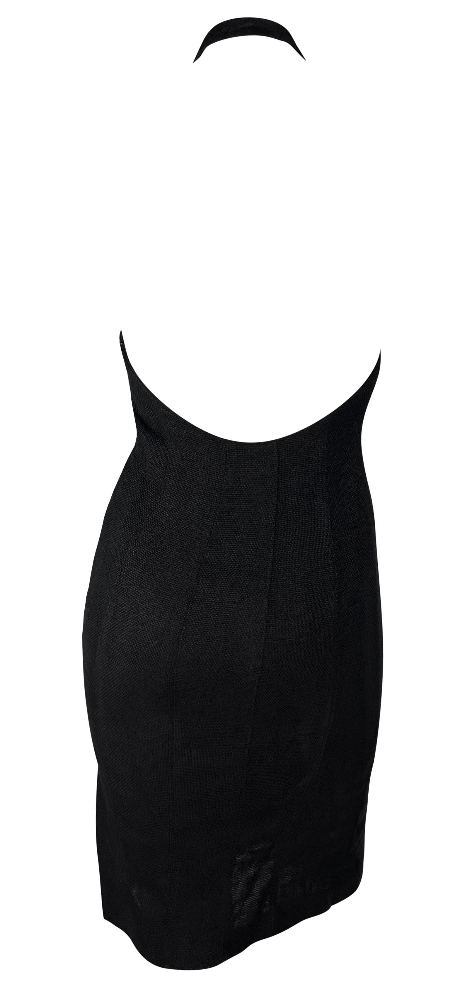 This Ralph Lauren Purple Label halterneck mini dress from the Spring/Summer 2007 collection is a modern yet sophisticated take on the classic little black dress. Debuting as look 13 on the runway, modeled by Hilary Rhoda, it features a halterneck strap, black satin pleated accents, and a button-down closure at the bust. The form-fitting design is finished with an exposed back, adding a touch of allure to this timeless piece.